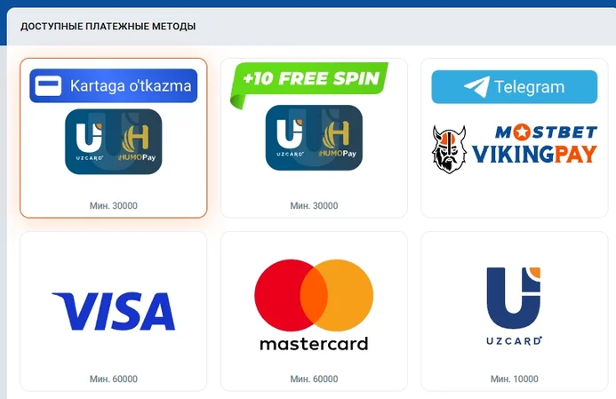 Букмекерская контора и казино Mostbet предлагает своим узбекским пользователям широкий спектр методов для пополнения счетов и вывода средств. Среди них: